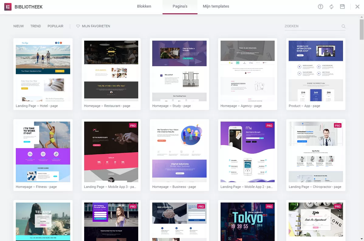 De bibliotheek van Elementor is te vergelijken met de mediabibliotheek van WordPress. De Elementor bibliotheek bevat tientallen professioneel ontworpen templates die je zo kunt importeren op je pagina.