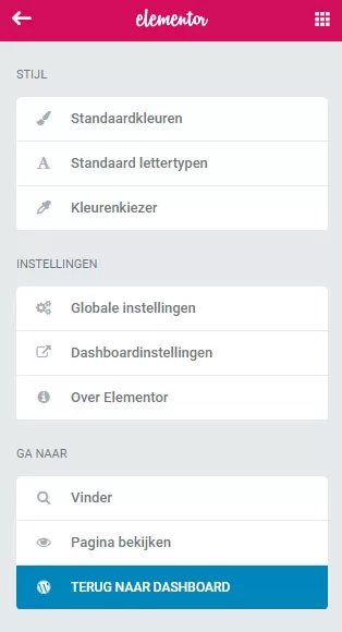 Door hierop te klikken kun je de pagina bekijken zonder de Elementor sidebar. Deze opent in een nieuw tabblad.