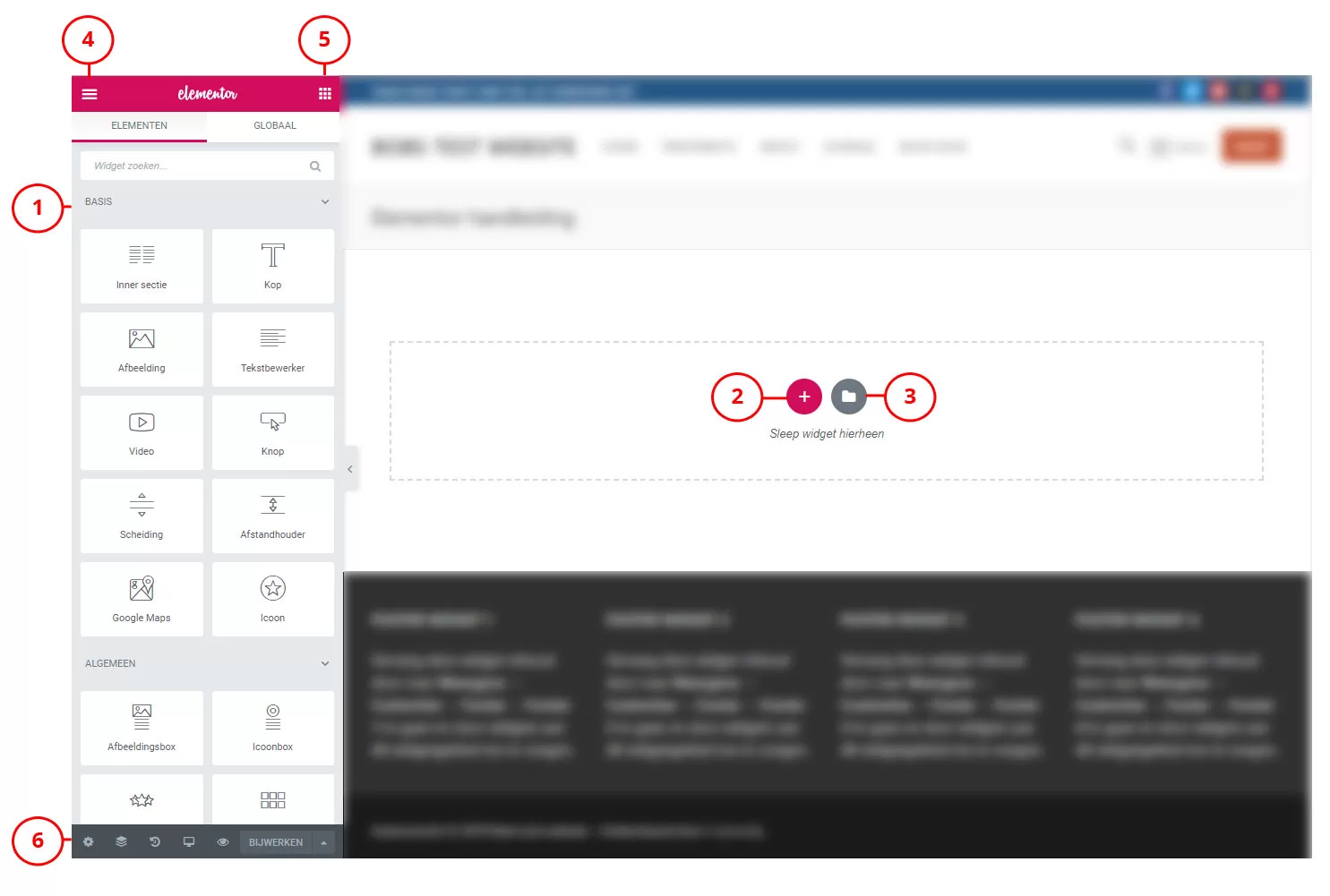 - ln de linker sidebar (1) vind je de widgets, waarmee je diverse soorten content kunt toevoegen. Als je bijvoorbeeld tekst wilt toevoegen sleep je de “tekstbewerker” widget naar rechts, en als je een afbeelding wilt toevoegen sleep je de “afbeelding” widget naar rechts . Als je al content op de pagina hebt staan sleep je de widget simpelweg naar de plek waar je deze wilt toevoegen.
