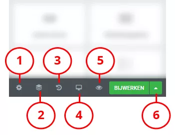 Onderaan de Elementor sidebar vind je een donkergrijze werkbalk met lichtgrijze icoontjes, en een grote groene knop “bijwerken”. Het zal geen verrassing zijn dat je op die knop moet klikken om je aanpassingen op te slaan 😉 Maar wat betekenen die andere icoontjes?