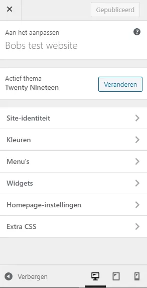 Als je daarop klikt opent de voorkant van je site, met een sidebar die een aantal instelmogelijkheden biedt.