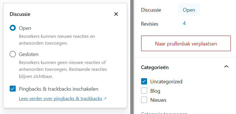 Als iemand een link naar jouw website plaatst in een artikel op zijn eigen website zal WordPress proberen automatisch een link naar dat artikel te plaatsen in de reacties op jouw website. Als je dit niet wilt toestaan dien je het vakje bij Pingbacks & Trackbacks uit te schakelen.
